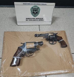 En su equipaje de mano, fueron detectadas dos armas de fuego tipo revólver, sin los documentos respectivos de inscripción y portación de ellas.