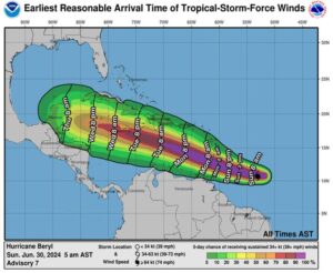 En la trayectoria del pronóstico, se espera que el centro de Beryl se mueva a través de las Islas de Barlovento temprano el lunes y a través del Mar Caribe sureste el lunes por la noche y el martes.