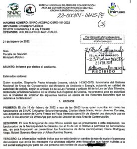 De acuerdo con el Informe SINAC-ACOPAC-OSRO-182022 del 21 de febrero del 2022 que firma Paola Alvarado, Encargada de Prevención, Protección y Control de la Oficina Subregional de Orotina del Area de Conservación del Pacífico Central del SINAC, el 15 de febrero del 2022 se llevó a cabo una inspección en Cerro Fresco para atender una información enviada a esa dependencia por daño ambiental en Cerro Fresco según datos enviados por Whattsapp.